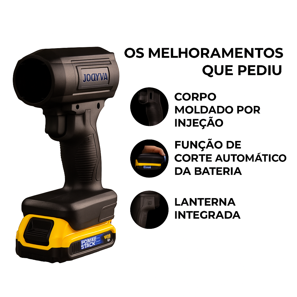 JOQYVA Blower Blower™ é a ferramenta multifuncional definitiva para profissionais e entusiastas. Concebido para ser portátil e potente, este soprador leve oferece um fluxo de ar incomparável para lidar com poeira, detritos, folhas e até mesmo manchas de água. Quer esteja a secar o seu carro, a limpar uma bancada de trabalho ou a arrumar espaços exteriores, o JOQYVA BloweR™ realiza o trabalho com facilidade.